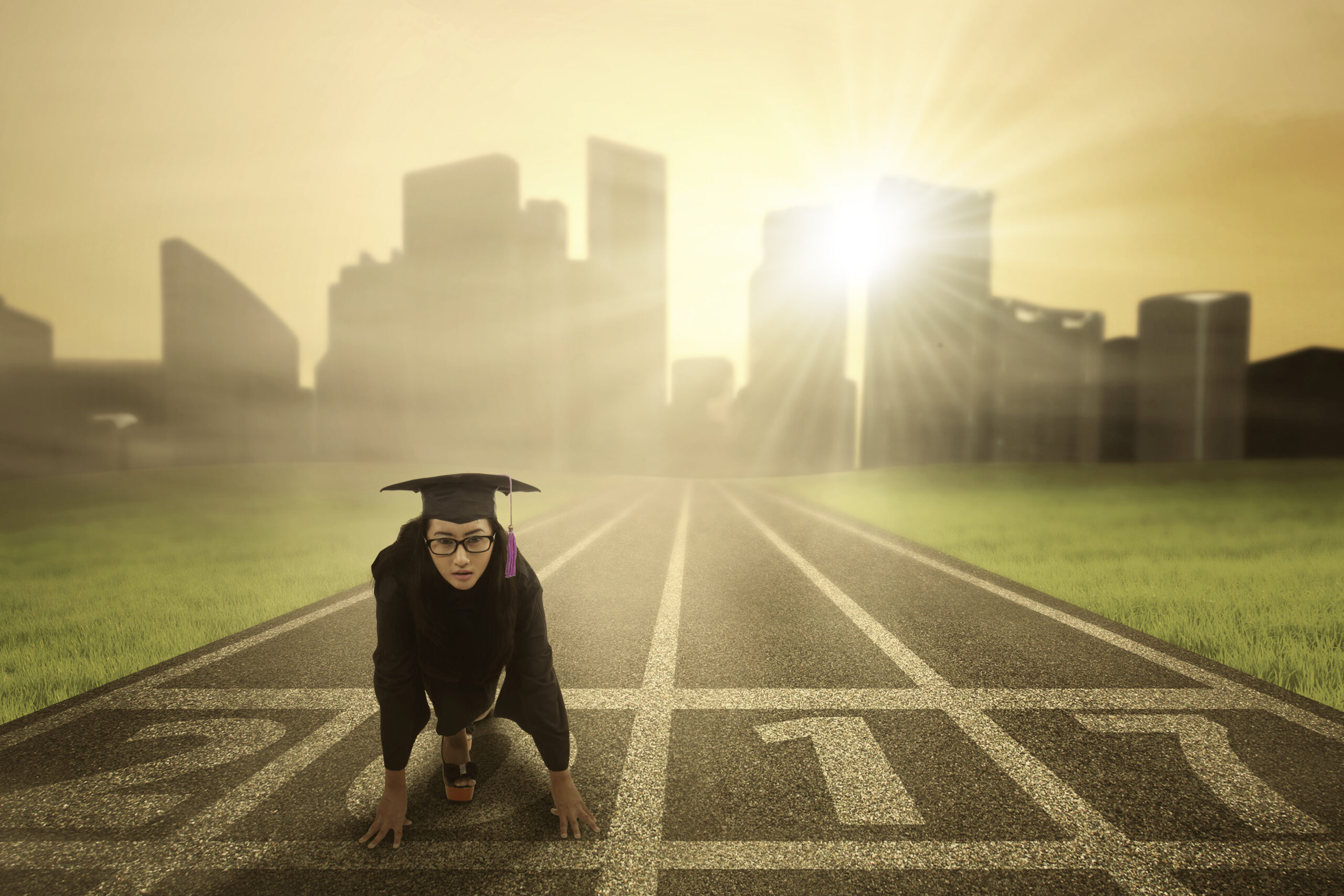 Portrait of young female bachelor in ready position to chase her dream with numbers 2017 on the road